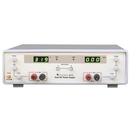 Scientech 4075 DC Dual Power Supply is designed as a Constant Current (CC) and Constant Voltage (CV) source for use in laboratories, industries and field testing. With compact size, light weight and low power loss, it provides DC output voltages for Analog and Digital testing.