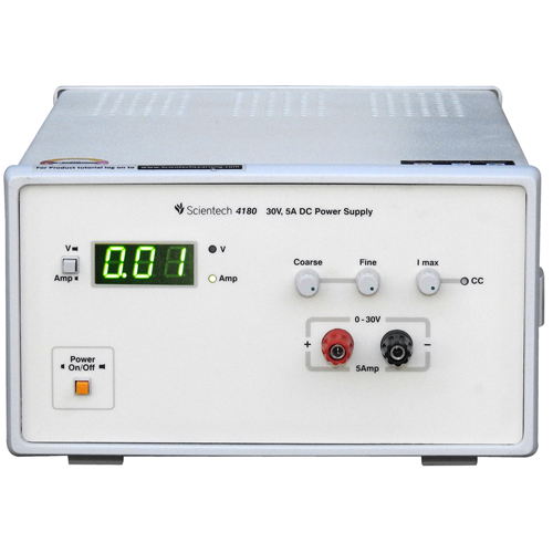 Scientech 4180 DC Power Supply is designed as a Constant Current (CC) and Constant Voltage (CV) source for use in laboratories, industries and field testing. With compact size, light weight and low Power loss, it provides DC output voltages for Analog and Digital testing.