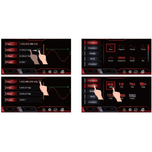 The combination of touch screen control with click and slide and multi-function knob makes it easy to find and update waveform settings; switch between channels, configure each channel, and easily load standard functions or arbitrary waves.