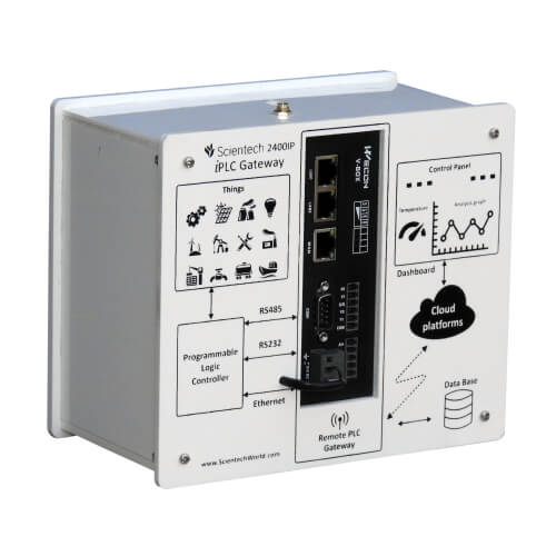 Scientech 2400IP iPLC Gateway is a industrial IoT solution for automation industry to remotely control a device or machine via cloud. It add values by process reduction downtime, allows live data monitoring, remote control , remote debugging , remote programming and boasts productivity. Users can create custom dashboard with drag and drop widgets, and get notification of events and alarms through SMS and email. An online cloud platform is used to log, view and analysis process data.