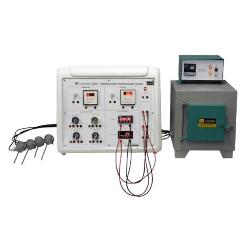 Scientech 3004 Potentiometer ? Thermcouple Test Set is complete setup to study Temperature measurement , measuring instruments and their characteristics. Scientech 3004 also gives the exposure to Industrial components ike Temperature Transmitter and sensors RTD (PT100), RTD (PT1000), K type Thermocouples, J type hermocouples, temperature display, Precision Potentiometer for resistance feeding with digital display , mili Volt source for voltage feeding with display and muffle furnace.