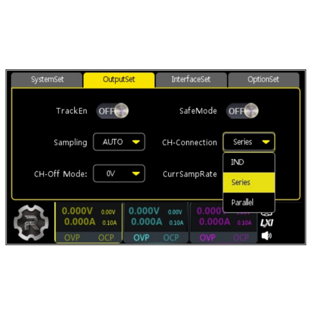 Channel 1 and channel 2 of the DP900 have added a one-key series-parallel function. The machine can realize serial 64V or parallel 6A output. Say goodbye to external cumbersome wiring and software switching to help your test efficiency