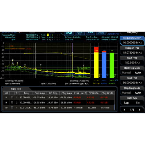The RSA3000E’s built-in EMI pre-compliance application software, combined with CISPR-compliant filters, pre-tests the product for conduction and radiation to identify and improve its conduction/radiation disturbance source and accelerate time-to-market.