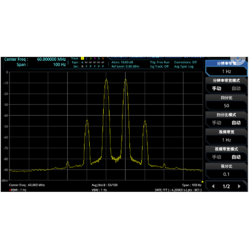 Resolving signals with similar frequencies is critical to verifying many RF devices and systems. With the RSA3000E, the RBW resolution bandwidth with a scan bandwidth of only 1 Hz allows you to view more details of adjacent signals.