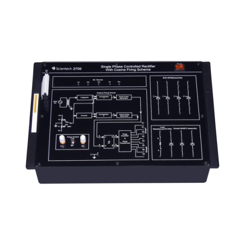 Scientech 2709 is a platform which helps Students to understand the various concept of Cosine wave firing scheme for single phase controlled rectifiers. 2709 is also useful for Students to perform controlled rectifiers on various configurations like half wave, full wave, bridge, symmetrical & symmetrical configurations. This platform is provided with built in AC & DC power supplies, sockets for making different interconnections in the circuit and exhaustive learning material.