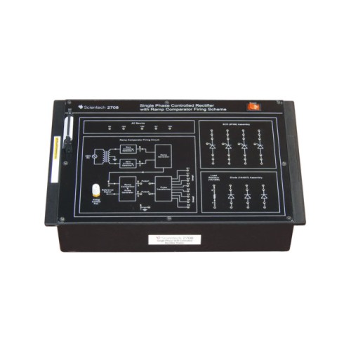 Scientech 2708 is a platform which helps Students to understand the various concepts of Ramp comparator firing scheme for Single phase controlled rectifier. 2708 is also useful for Students to understand the various rectifier configurations like half wave, full wave, bridge, symmetrical & asymmetrical configurations. This platform is provided with the built in AC & DC power supplies, sockets for making different interconnections in the circuit and exhaustive learning material.