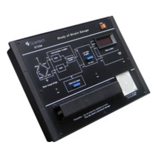 Strain Gauge Scientech 2304 provides study of Strain Gauge and their application for measurement of Strain. It helps to study bridge configuration of Strain Gauge and the signal conditioning circuits required to measure strain. It uses cantilever beam arrangement to produce strain on Strain Gauge.