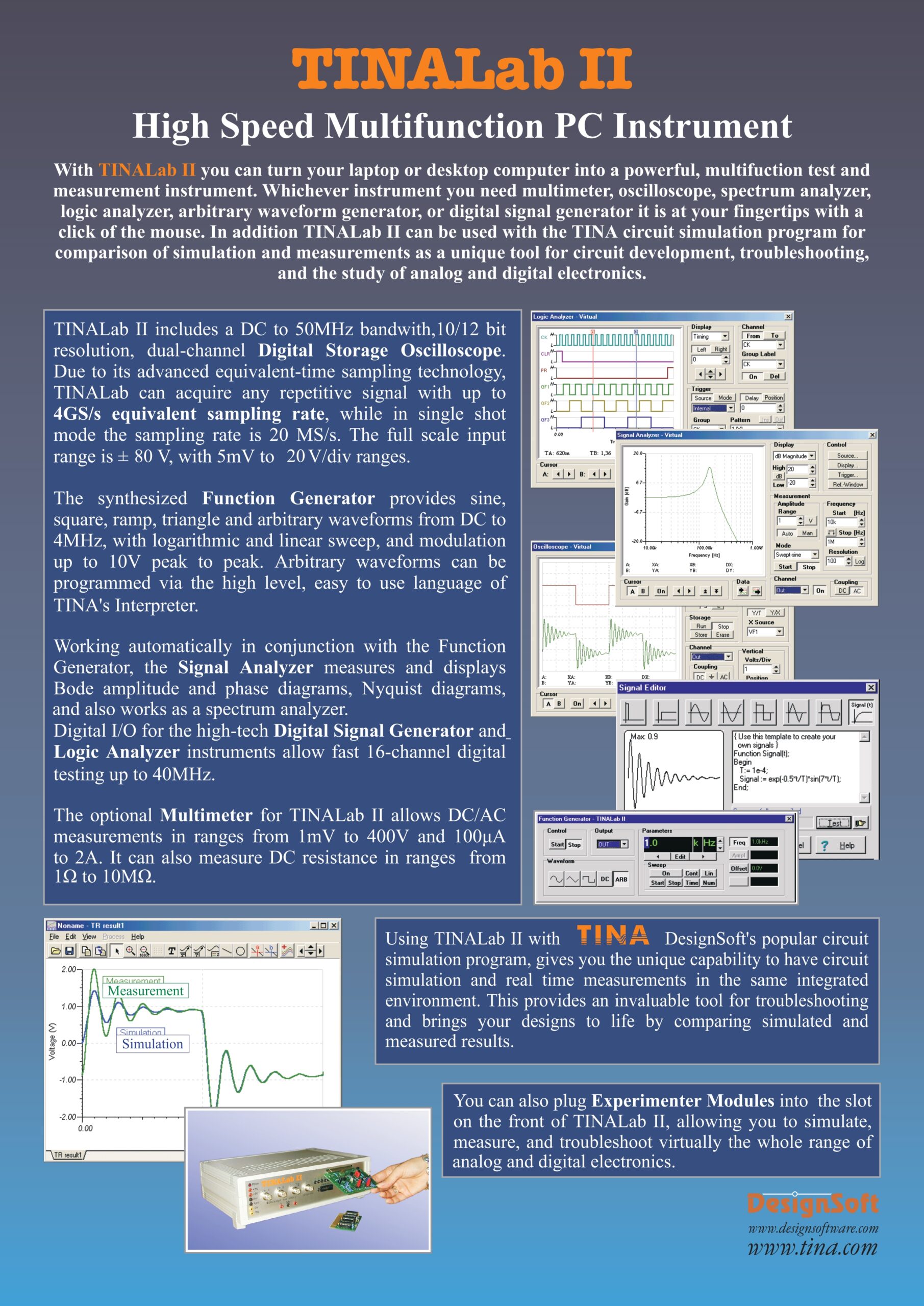 TINALab II includes a DC to 50MHz bandwidth, 10/12 bit resolution, dual-channel Digital Storage Oscilloscope. Due to its advanced equivalent-time sampling technology,