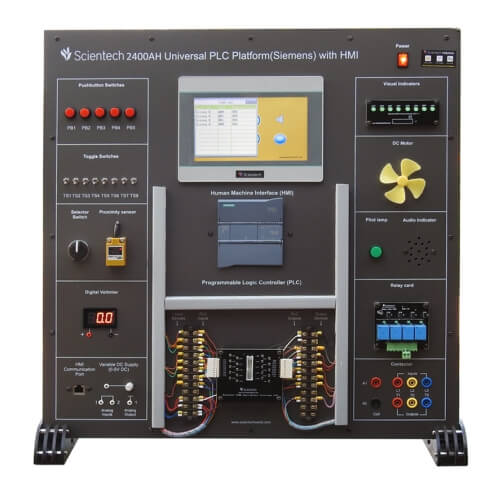 PLC and HMI have adapted well in modern Industry 4.0 programming will continue to play an integral role in the manufacturing processes. Further, the integrated HMIPLC is enabling lean automation-boosting efficiencies and reducing waste, both in terms of equipment and time. Looking at career opportunities offered by Industry 4.0, Scientech has designed a Universal PLC platform with HMI and Siemens PLC. Scientech 2400AH/BH/CH is an ideal setup to study the working of PLC and HMI used for industrial applications. It has been designed to learn and practice:
