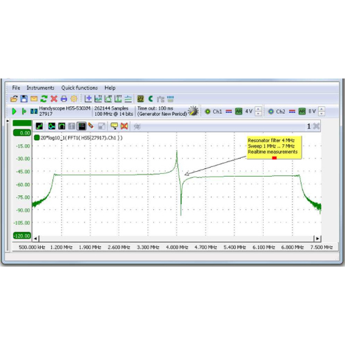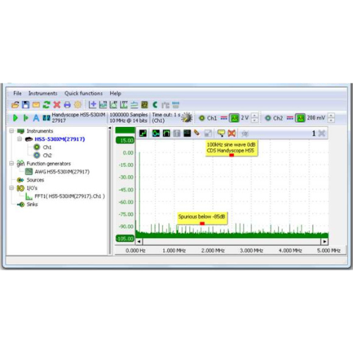 Handyscope HS5 into an oscilloscope, spectrum analyzer, data logger, multimeter and protocol analyzer.